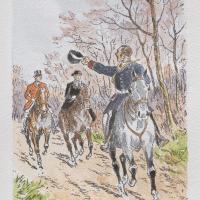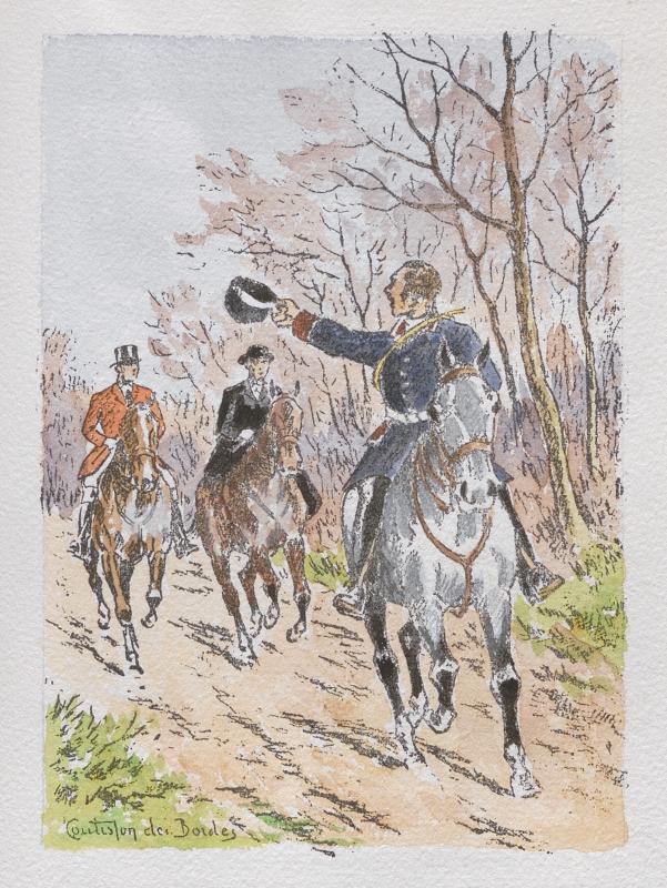 Roger Coutisson des Bordes a consacré une partie de sa vie, après avoir été blessé pendant la première guerre mondiale, à deux passions : le dessin et la vénerie. Il a réalisé de nombreuses illustrations pour les éditions Ardant. Il a aussi illustré plusieurs ouvrages sur la chasse à courre et la vénerie. Cette planche est issue d'une édition originale sur pur fil Johannot, exemplaire de tête n° 3. Dans cette série, les dessins ont été coloriés par l'illustrateur.